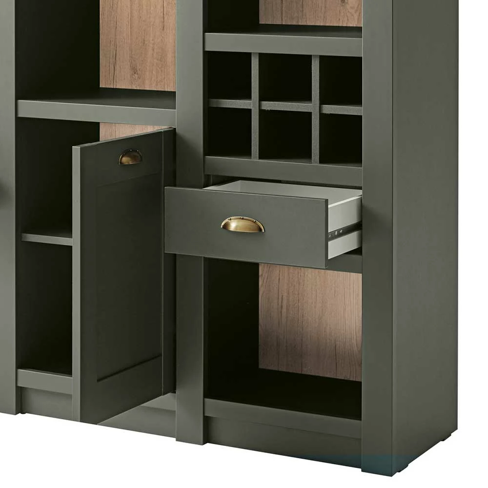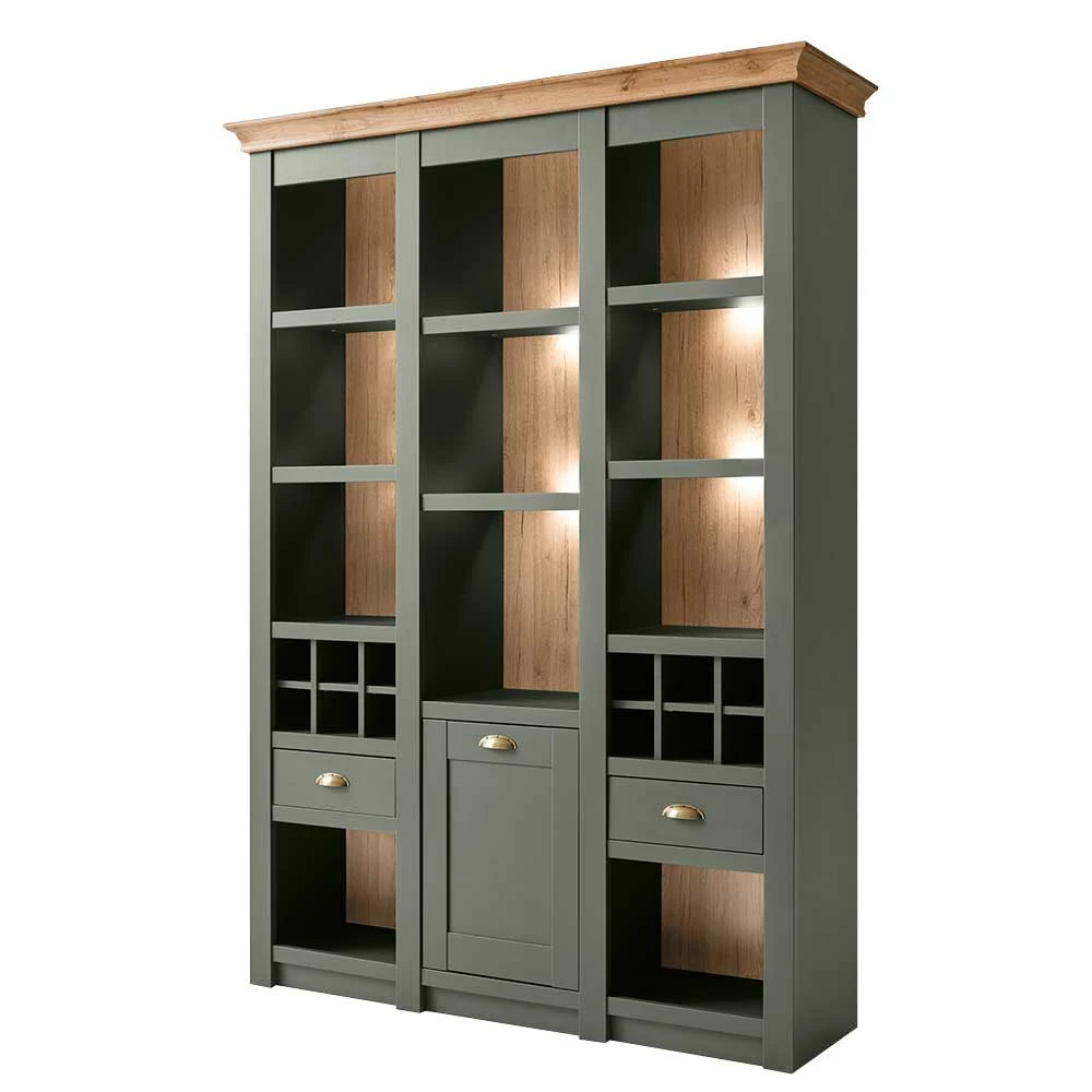 - Oberfläche melaminbeschichtet in Graugrün, Kranzleiste und sichtbare Rückwand foliert in Holzoptik Wildeiche