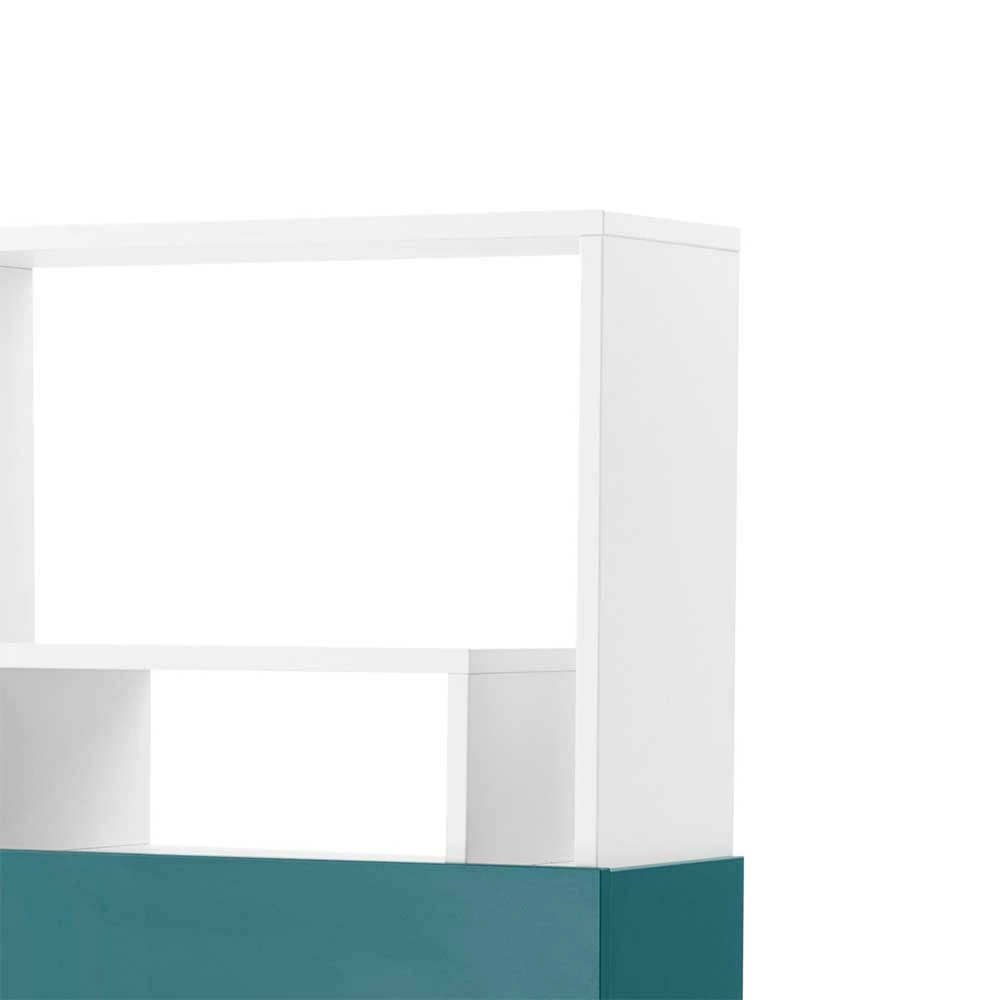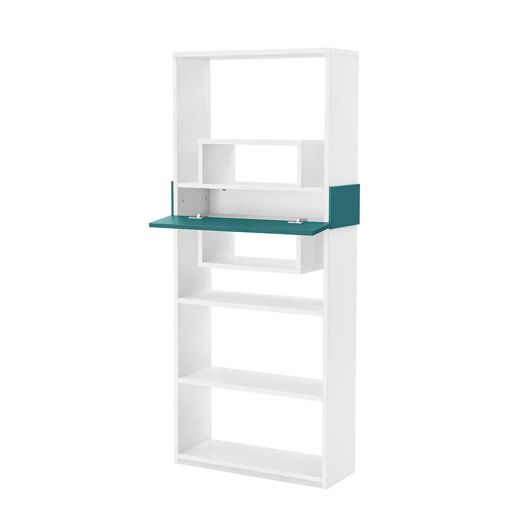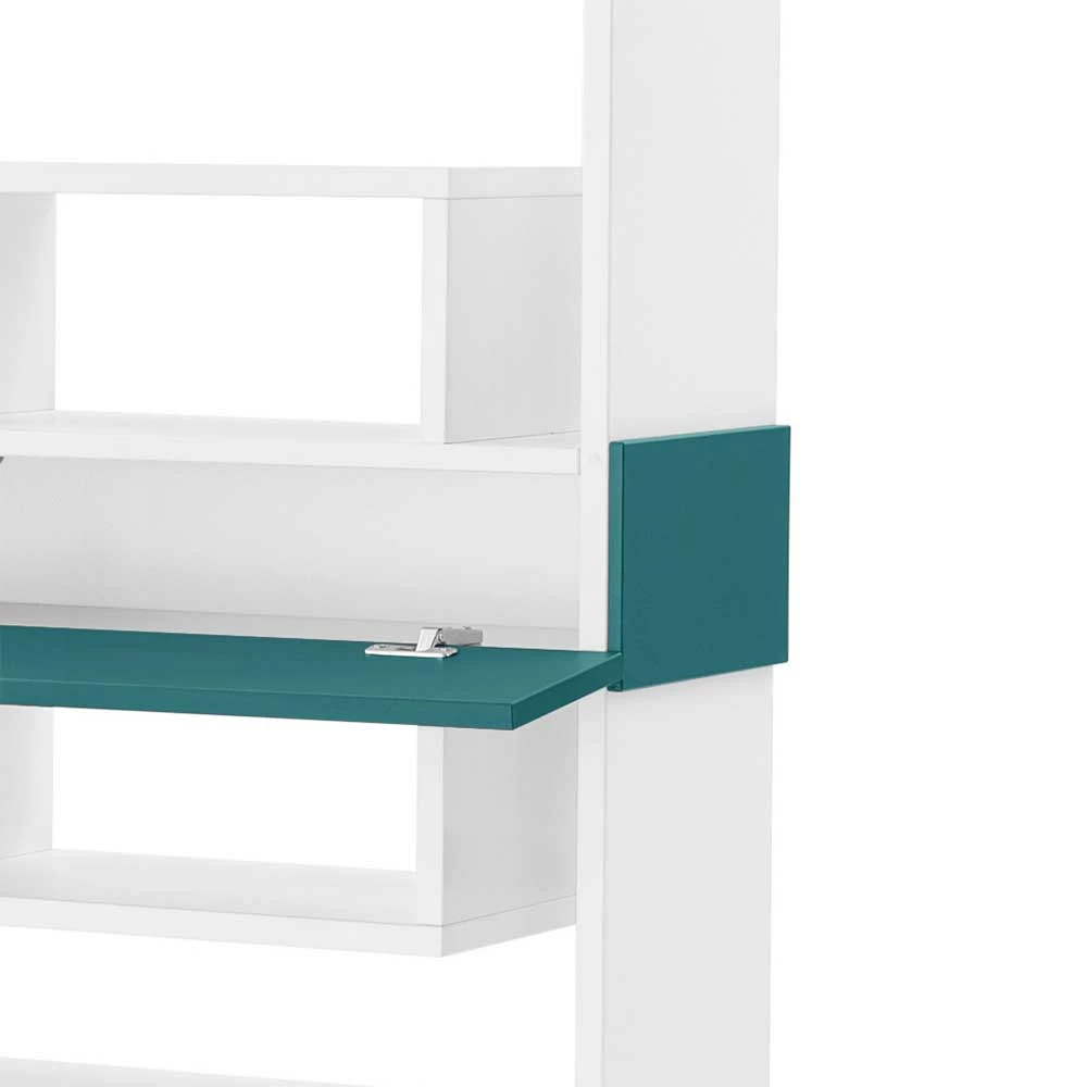 - Mittig ein geschlossenes Fach, verdeckt durch eine farbige Klappe in Petrol, zu öffnen durch leicht überstehende Front
