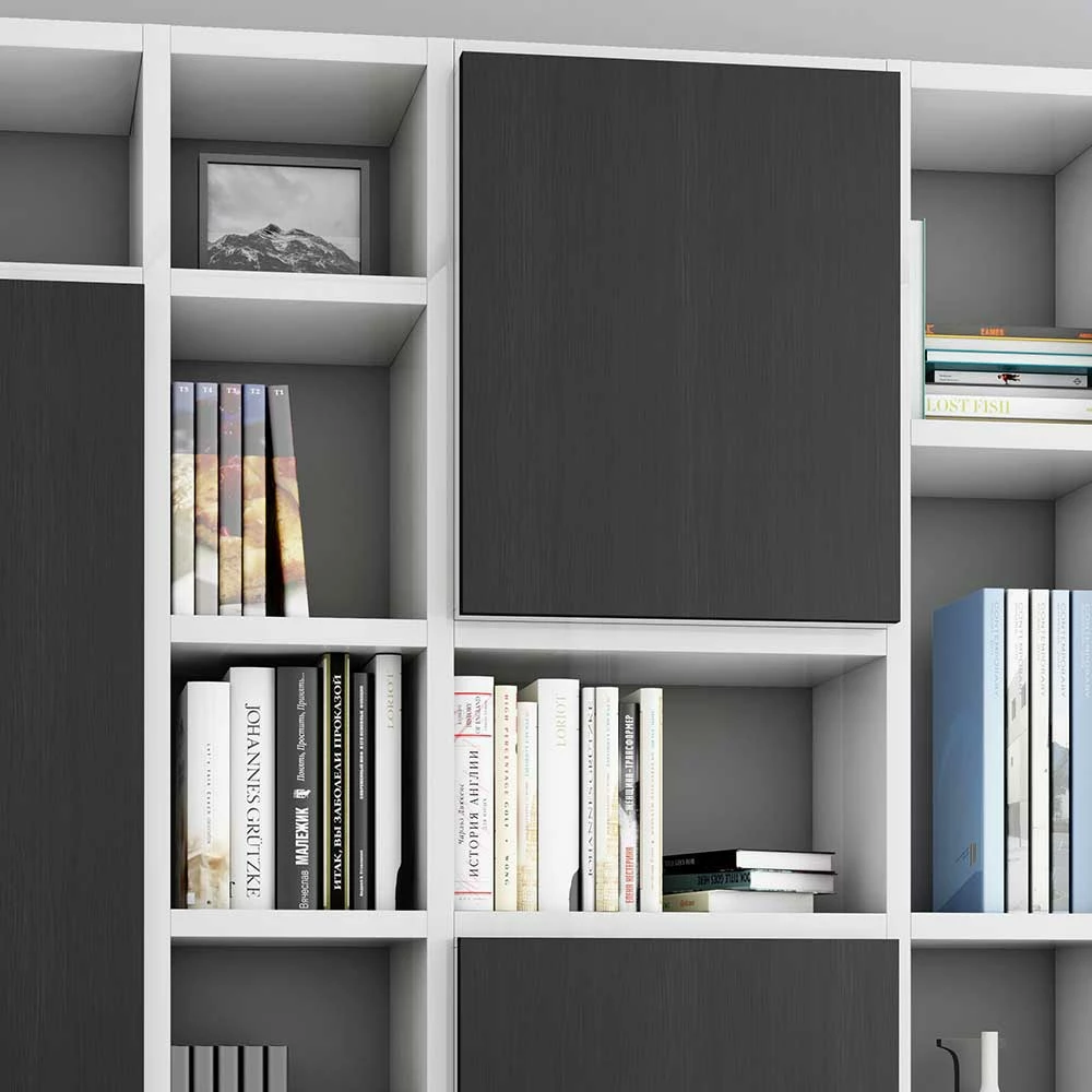 - Einfach zu pflegende Oberflächen, Korpus in Hochglanz Weiß lackiert, Türen im Holzdekor Eiche Schwarz Braun foliert, Einschübe foliert in Weiß