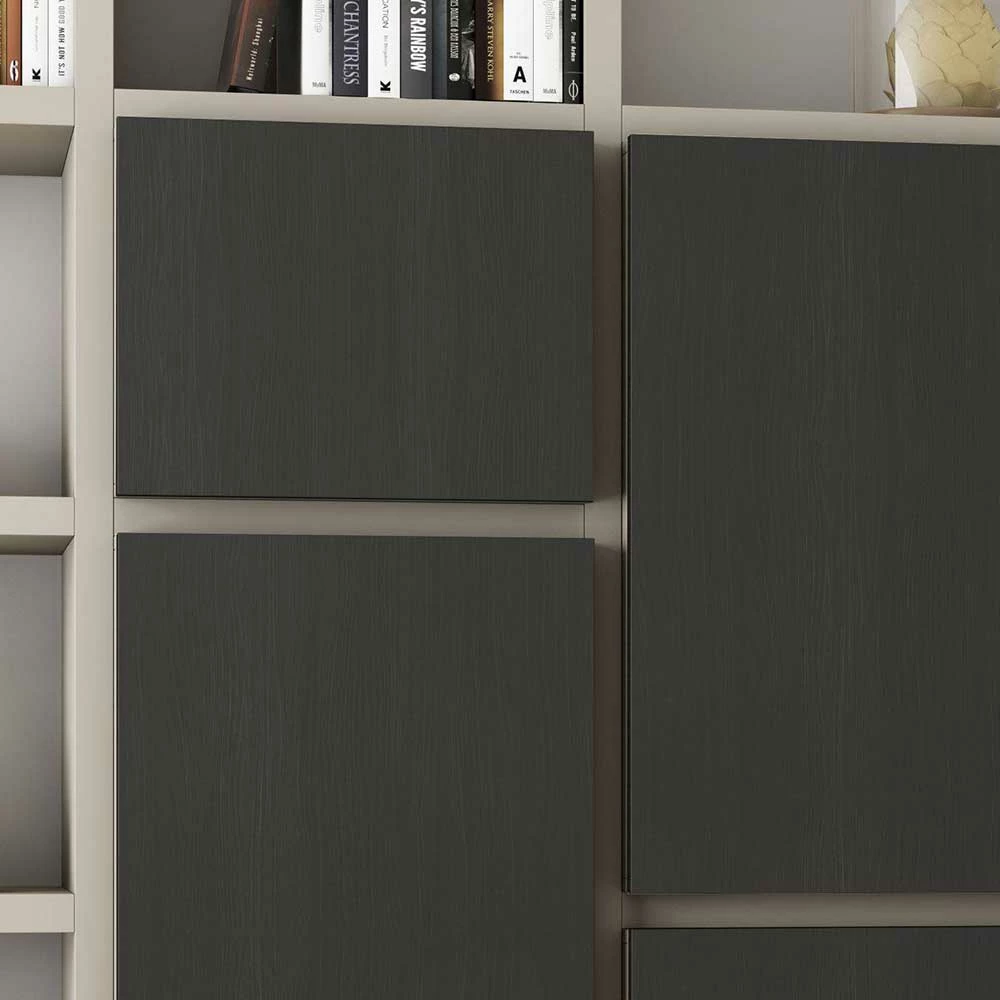 - Korpus in Beige matt lackiert, Front im Holzdekor Eiche Schwarz-Braun und Einschübe in Beige foliert