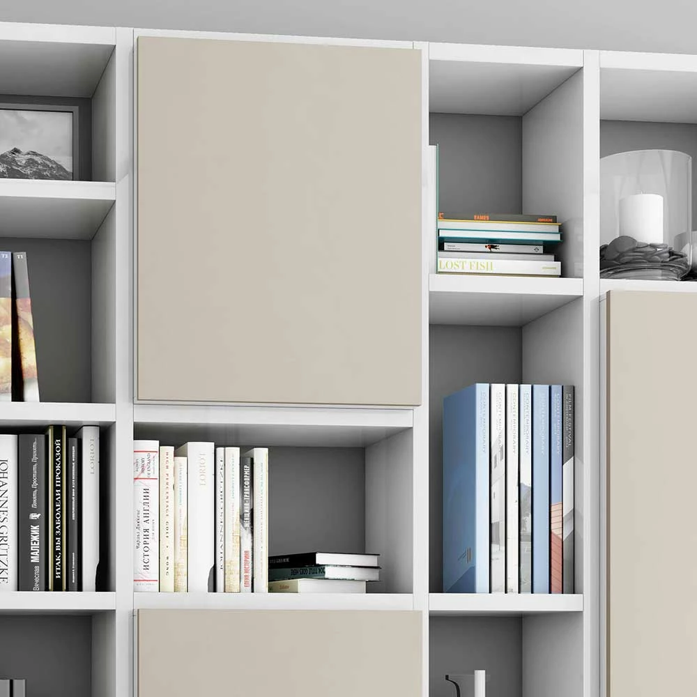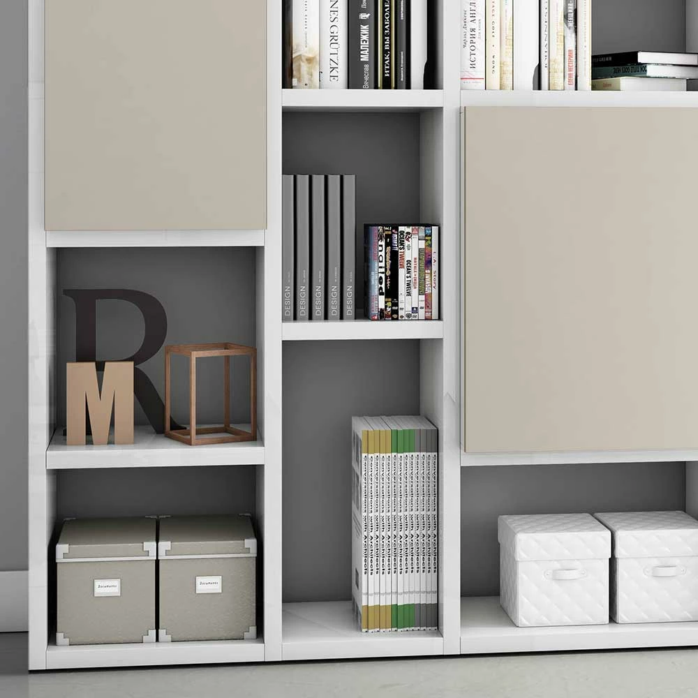 - Exzellente Regalwand in Hochglanz Weiß und Beige