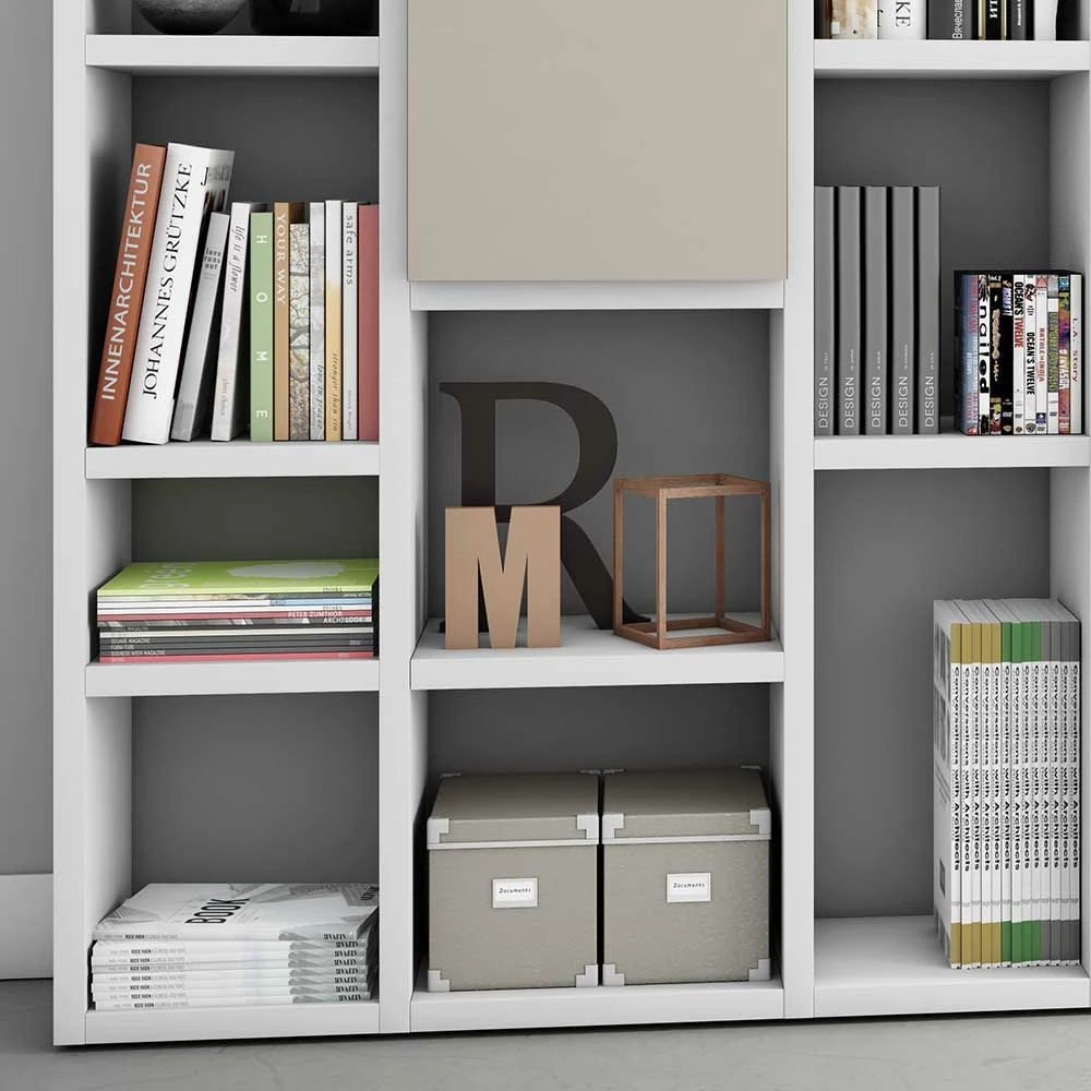 - Trendige Regalwand in Weiß, Beige matt und Eiche Schwarz Braun